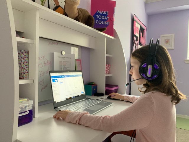 My fourth grader needs reminders as she toggles between live Zooms and independent work multiple times a day. Her daily schedule is on the white board above her desk, but I peek in often to make sure she’s where she needs to be. Our district is flexible with attendance and that helps. So even if one of my two misses a Zoom, they can still complete the classwork and be counted as “present” for the day.