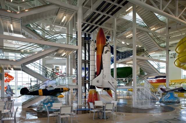 Located within the Evergreen Aviation & Space Museum, Wings and Waves Waterpark features ten slides and a 703-gallon wave pool. The showstopper of this indoor park is the real Boeing 747 that sits on top of the building. It serves as the launchpad for four of the park’s larger slides. That’s about 62 feet above the splash landing. Families will love the forest-themed Aqua Play area which offers interactive activities and three slides just underneath a helicopter carrying a 300-gallon bucket of water that's dumped every few minutes. The Vortex Pool will whip you around at a safe but surprisingly fast pace.
