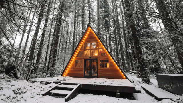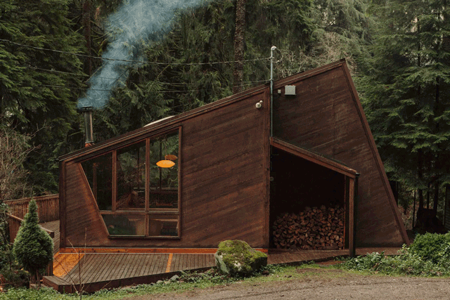 Located in Seattle North Country, Canyon Creek Cabins are another option for an enchanting winter escape. A modern take on the A-frame, every detail is a design-fanatics dream. Gorgeous wood furniture, fireplace, hot tub, indoor hammock, sleek bathroom, and family-size dining table on the deck by the roaring creek. This cabin is great for larger groups as well as four-legged canine friends.