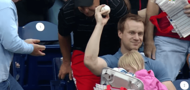 Super Dad, or no? During a baseball game between Philadelphia Phillies and Toronto Blue Jays last week, a dad in the stands managed to catch a foul ball with one hand while holding onto his napping daughter with the other. It has reached over 1.4 million views on YouTube since it’s upload last Thursday. Watch the impressive catch below: