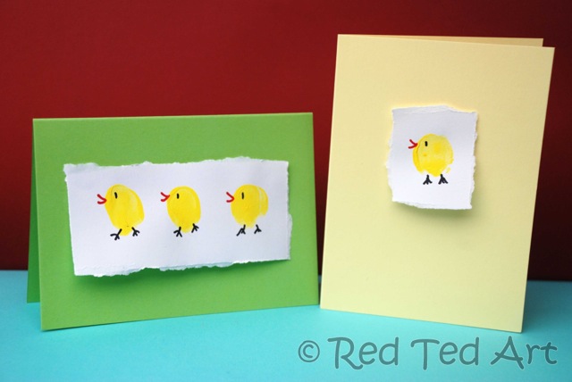 Here’s a super simple craft from Red Ted Art’s Blog that would make the perfect card for your little one’s favorite friends and family. A plain yellow thumbprint becomes a cute little chick with the addition of a beak and some little feet.