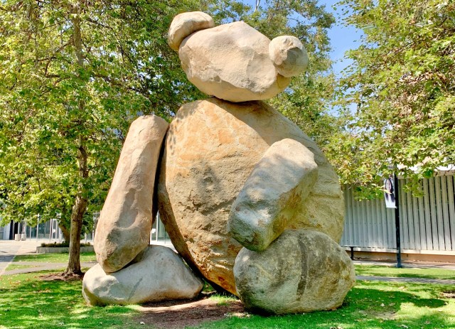 Learn about art as you walk around the UCSD Campus on the free self-guided Stuart Art Collection Tour. You’ll discover more than 20 sculptures spread all across the campus. Many of these artists have won prestigious honors and awards for their artistry. Don’t forget to look up, down and even use your ears in the wind garden. The most notable piece is the "Fallen Star" house on top of a building that looks like it's falling off, number 18 on the map and this "Bear" is number 16.