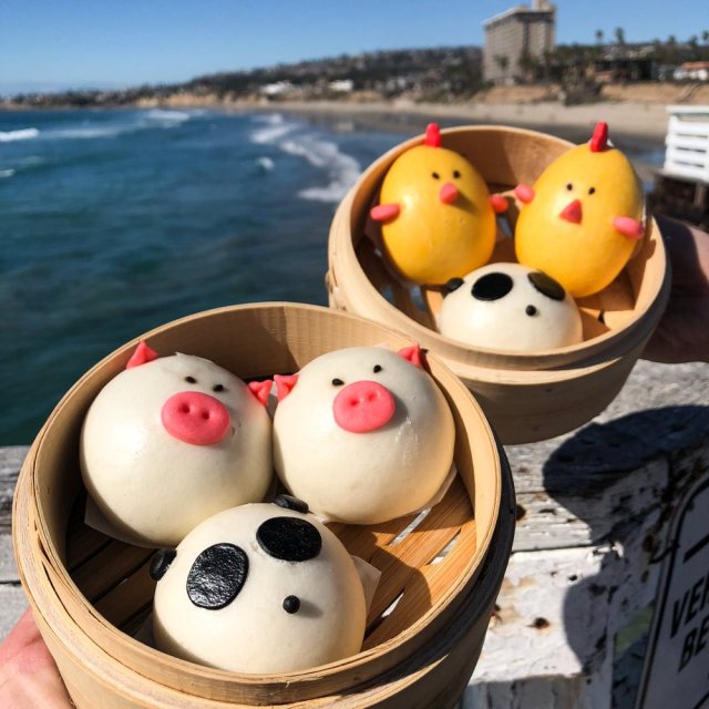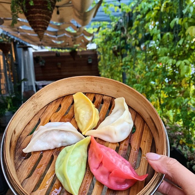 These decadent dumplings are made fresh-to-order. Little eaters can watch them rolled from scratch right before their eyes! We love this restaurant's homey vibe and stylish decor with macrame hanging plants and a fire pit for outdoor dining. The dumplings are delish and you can choose between many different fillings. Order up their rainbow dumplings sampler and get one of each flavor: cabbage, chives, veggie, chicken & shrimp. Kids will love the cute panda bear or pig dessert bao with custard inside too.