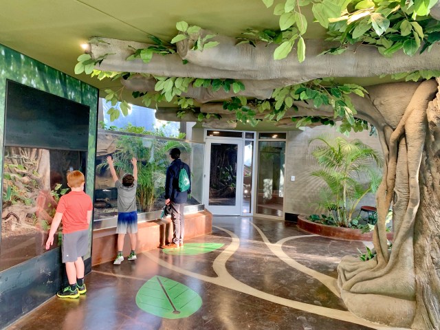 Walk out the back and into the Rainforest, where you'll be high up in the tree branches. This is a multilevel outdoor environment filled with caiman and tortoises. The stage is here for wildlife ambassadors that visit the Basecamp every day and where you can meet one up close!