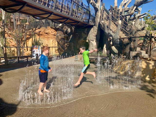 Kids can run through the waterfall grotto and get drenched as water pours over eroded bluffs. Two zones have different splashing jets that will delight your water-loving kiddos. TIP: All of this water fills up a shallow stream that will be perfect for littles to sit and splash in; head towards the ends of this stream because they’re a little further away from where bigger kids will be playing.