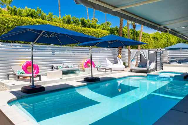 The ultimate family-friendly rental in Palm Springs, this four-bedroom Airbnb has it all and more. Comprised of a 3BR main house and a detached studio (perfect if you're taking a trip with extended family or friends) this rental is only a four-minute drive from downtown Palm Springs. Kick back in the poolside cabanas while burgers sizzle on the gas grill, then dine alfresco at a covered table for eight. Additional features include a badminton court, a shuffleboard court, an outdoor billiards table, an outdoor shower, and a sleek gas fire feature. A 5-hole putting green adds to the fun. A misting system delivers cool refreshment. Kids of all ages will delight in this weekend's getaway.