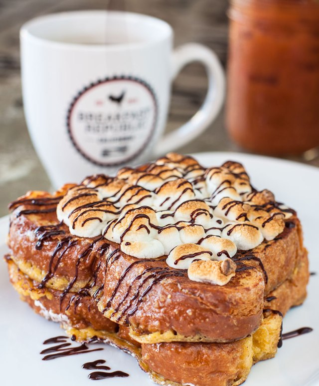 How sweet it is! Breakfast Republic's S’mores French Toast is graham cracker crusted brioche bread topped with toasted marshmallows and chocolate sauce. All that's missing are the campfire and ghost stories.