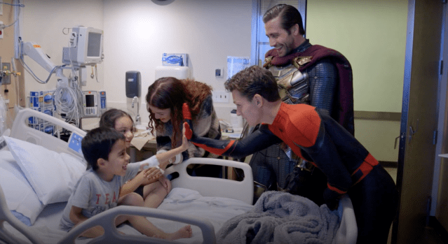 Kids at Children’s Hospital Los Angeles were treated to an advanced screening of the new film Spider-Man: Far From Home and had the opportunity to hang out with the costumed stars. Tom Holland, who plays Spider-Man, along with Jake Gyllenhaal (Mysterio) and Zendaya (MJ) paid a visit to the excited patients.