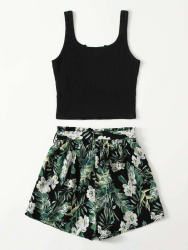 Rib-Knit Tank Top and Tropical Print Shorts from SHEIN