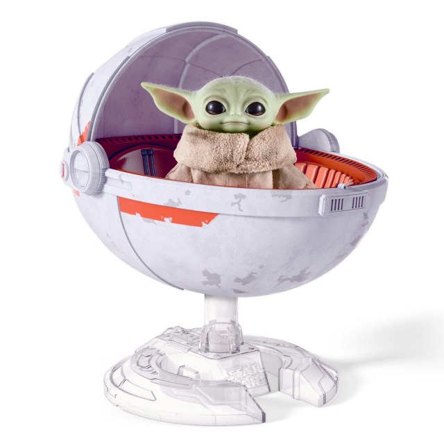 Mattel Creations' "The Child Collector Edition Plush" comes with accessories inspired by The Mandalorian, including a control knob and Chowder Squid. The Plush comes with protective Hover Pram that features motorized doors that open and close and an adjustable stand.