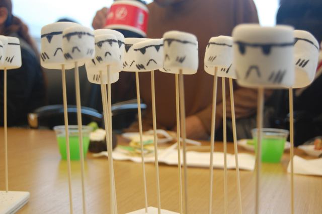 Make treat time totally troop-worthy with this easy little track (makes a great cupcake or cake topper, too). Just put marshmallows on a stick and use an edible pen to draw the masks on.