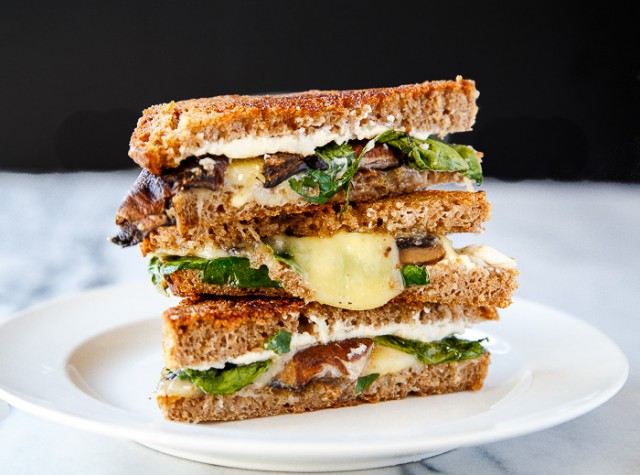 Ready for all the flavors of delicious stuffed mushrooms packed conveniently between two slices of bread? Whipped up in the kitchen by the food blog, Dessert for Two, this ooey gooey sandwich is not your average grilled cheese panini. Get ready to see this sandwich of healthy greens, mushrooms and melted cheese disappear into hungry tummies in no time at all.