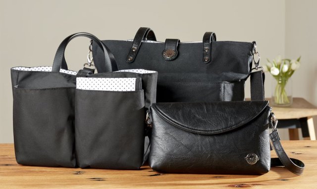 This tote, organizer insert and diaper clutch can handle all of life's adventures. The tote sports eight pockets and a laptop pocket and comes with an extra strap to convert it into a messenger bag or backpack. Slip the organizer insert into the tote or use it on its own; it has carry handles, a snap closure and seven handy pockets. The vegan-leather diaper clutch can also be used solo; add the removable crossbody strap to keep your hands free. The clutch fits the included wipe-clean changing pad, diapers, wipes and more. Best of all, with each purchase, Momkindness donates a portion of the proceeds to nonprofit organization Every Mother Counts, which works to bring safe maternity care to mothers around the world.