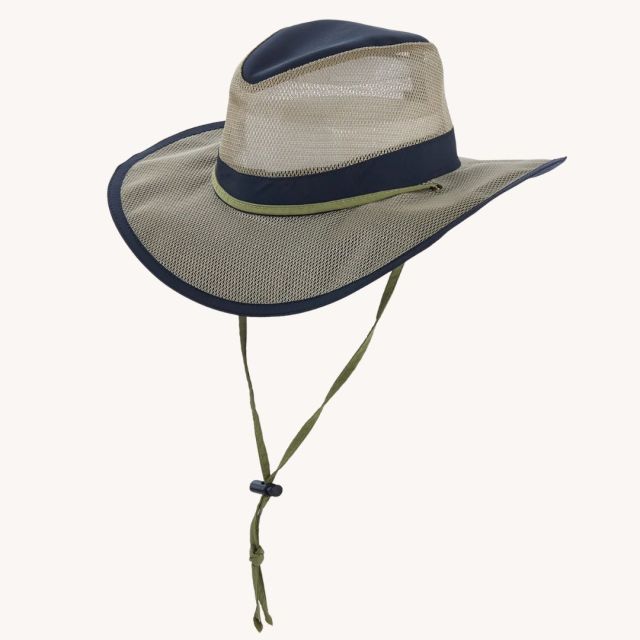 The distressed look of this hat makes it look well-broken-in before you even put it on. Plus, the mesh crown keeps you cool and the chin strap keeps the breeze from grabbing it.