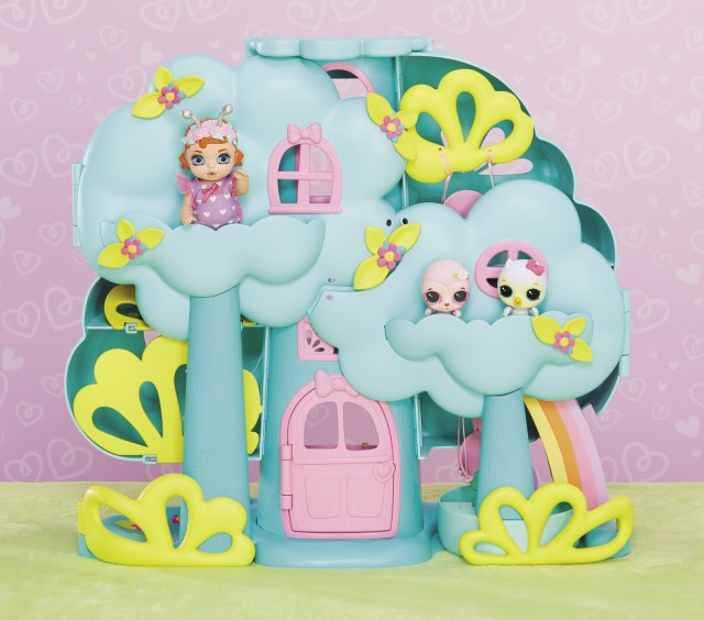 Not a one-trick butterfly: There is so much for littles to explore and discover. The treehouse opens up to reveal a play-full house plus a playground for all of their BABY born Surprise Babies and Pets to frolic in. There’s a Ferris wheel, merry-go-round, slide, swings, elevator and more. This tricked-out treehouse has it all—even a flower shower that really sprays water so baby dolls and furry friends can splash in a bath.