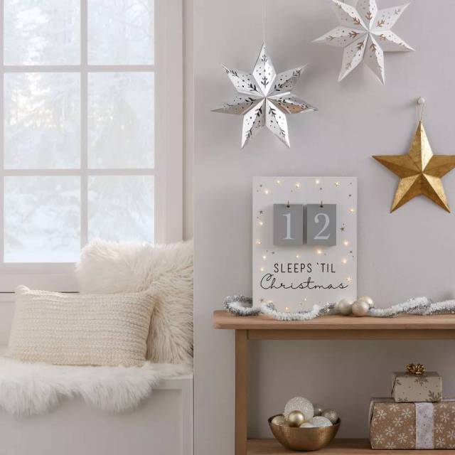 Counting down to Christmas just got more magical. This sweet 'Sleeps 'til Christmas' Countdown Sign is made from MDF, has removable tiles and light-up gold stars.
