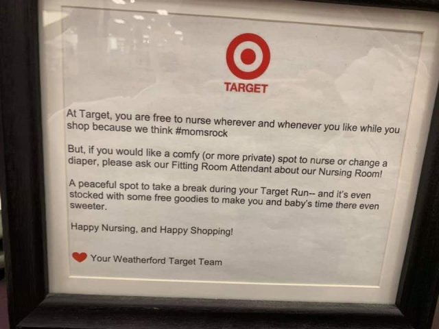 The sign posted in a Target in Weatherford, Texas was shared on Facebook by a Target customer and quickly went viral earning praise from moms across the country. The letter reads, “At Target, you are free to nurse wherever and whenever you like while you shop because we think #momsrock.”