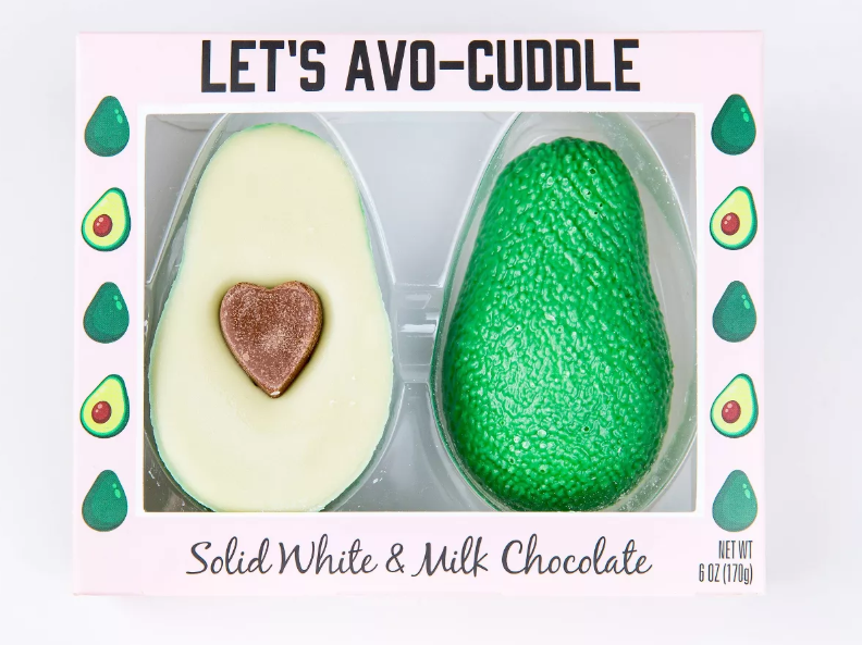 Charmingly titled, “Let’s Avo-Cuddle,” this solid white chocolate avocado features a heart-shaped, milk chocolate pit. This realistic treat retails for $5.99.