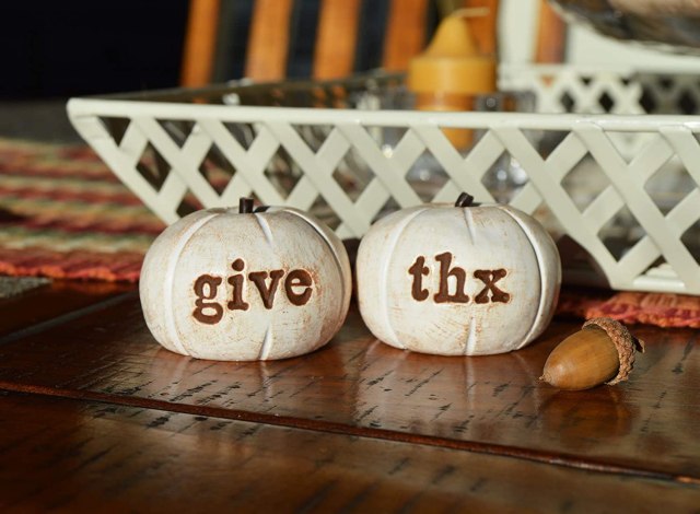 What better centerpiece can you have besides rustic pumpkins with the message "give thanks?" These handmade gourds are made from polymer clay and are just the right size to make a statement without overwhelming the table. Plus, they leave plenty of room for the food!