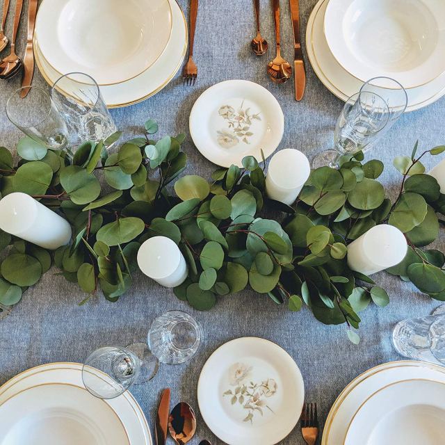 Farmhouse decor doesn't typically lend itself to the traditional reds, yellows and oranges of Thanksgiving, but you can still get the holiday vibe by bringing neutral greenery into your design with a eucalyptus garland. The silver dollar design is moldable to your tablescape and brings just the right amount of living garland to your table.
