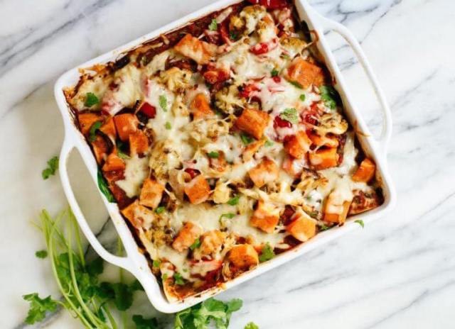 For a gluten-free veggie option, this layered enchilada casserole reinvents traditional lasagne with fab results. The recipe at Cookie and Kate uses salsa, veggies, corn tortillas and Monterey Jack for a hearty, veg-packed dinner loaded with fresh Mexican flavors.