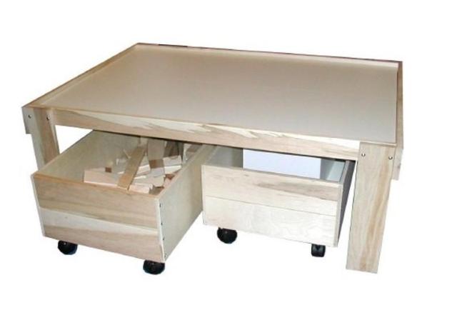 This train table stands 20-1/4" high and comes with a two piece Baltic Birch plywood top that encourages open-ended play. Stain or paint it however you'd like, the table comes unassembled and you can request a different height if you prefer. Storage trundles sold separately.