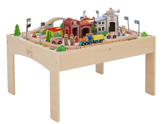 Build your dream town with this train table that comes with 85 pieces including a fire station, two helicopters, wooden train, greenery and more. The sturdy wooden toy train track pieces can be arranged in three different ways to create a variety of track courses.