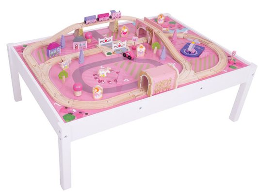 This fun train table includes high quality wooden train tracks, a pastel-colored engine and two carriages plus a boat, heliport, bridge, tunnel, trees, magical toadstools, fairy figures and a unicorn.