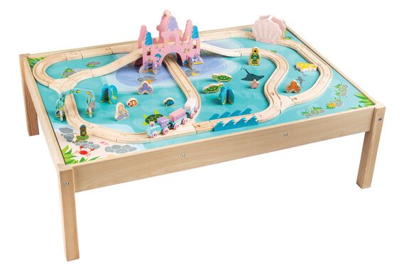 Dive into hours of imaginative underwater play with this adorable playset. It includes a sturdy wooden play table, wooden track pieces, a colorful engine and two carriages that feature a removable treasure chest and clamshell. Plus, mermaids, an enchanting sea castle, submarine, underwater creatures, a diver and more.