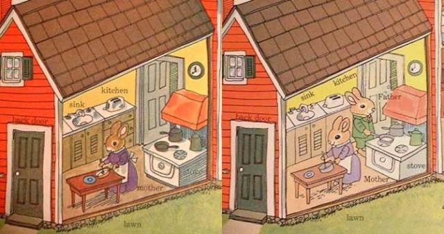 In the 1960’s “women’s work” was limited to the kitchen. In the updated version both Mother and Father are seen in the kitchen cooking.