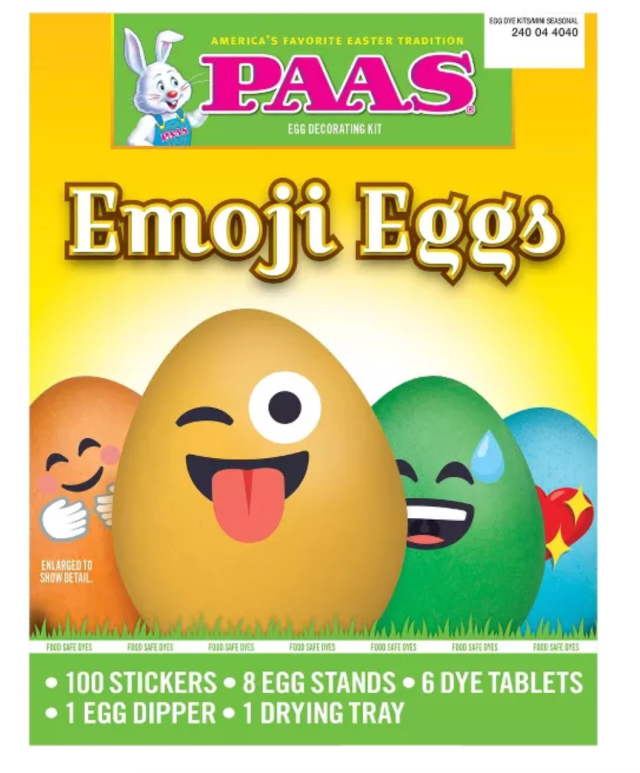 Happy, goofy, laughing. You can create these emoji eggs (among others) with the 100 stickers that come with this kit. There’s also six dye tablets, eight egg stands and one egg dipper.