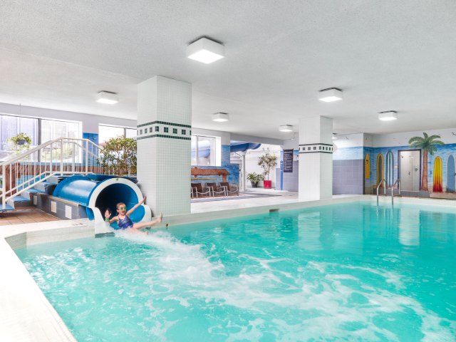 They also have a game room where the tweens and teens congregate, and an adults-only pool on top floor for parents to get some time away. On-site food options are plentiful and you can even have a pizza delivered to your room if you wish. Kids will get a kick out of the kids check-in stand that welcomes them upon arrival.