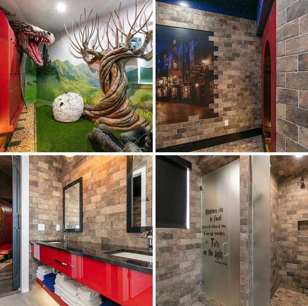 While the rest of the house seems like a relatively traditional pad, the Harry Potter theme takes flight when you reach a wall that resembles the 9¾ platform. If that doesn’t alert you to the possibility of things getting wacky, the locomotive—where you’ll find sleeping quarters—the nook inhabited by a dragon, the Whomping Willow, Hagrid’s pet spider, even a thematic bathroom will.