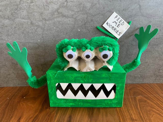 Your monster could be any color and have anything added to it. There are endless ideas on the internet. Let this monster be your child’s creation. The important concept is to have a mouth or a slot where your child can insert a paper with a written or drawn worry.