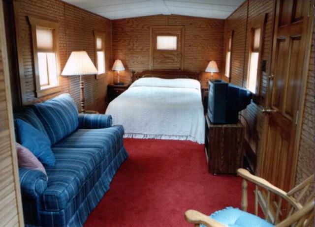The train cars at The Antlers Inn were once actual working railroad cars. Choose from one of three identical cabooses or a wooden rail car. Refurbished within the original framework of the car to provide family fun accommodations, each caboose houses the original cupola with seating, so little ones can oversee the train just like a real conductor. All have climate control, beds, baths, living area with TV, efficiency kitchens, and an outdoor gas grill with a picnic table.
