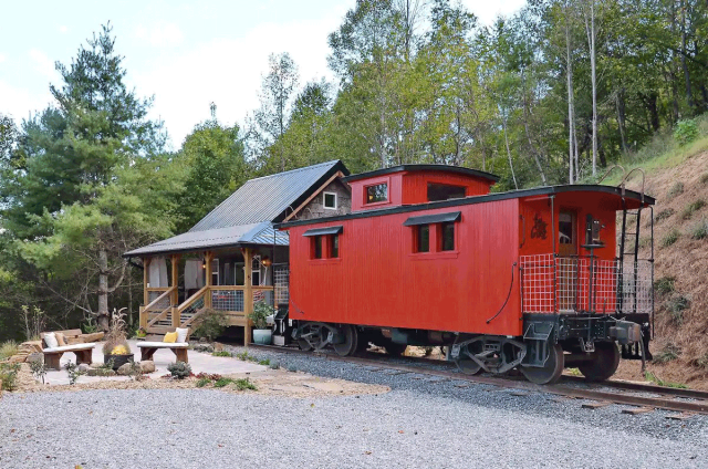 Just 10 miles from the Great Smoky Mountain National Park, this 1926 wooden train caboose has been transformed into one of the most unique vacation destinations in the area. This bright red storybook caboose was part of the Chesapeake and Ohio Railway. The caboose cottage itself is located on a private 20-acre residential farm. It sits atop authentic 1920s railroad tracks and joins with the incredible bath house also known as the Depot.