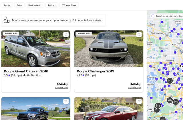 Finding your car: Type in your destination and the dates you need a car, then select your preferred car type and features (like electric, family-friendly, pet-friendly, etc.) to view a list of available cars. Hosts that have the most experience and best reviews are listed as “All-Star Hosts,” which can give you a good idea of your chosen car’s condition and how easy communication will be with your host.