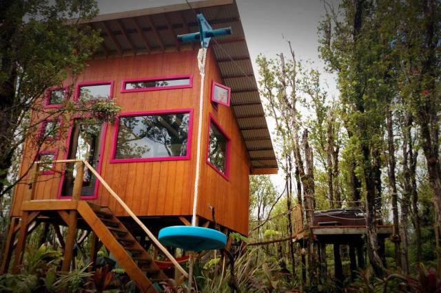 If your idea of a vacation means starry night skies and the soothing sounds of the jungle all around you, this cozy Hawaiian eco-cottage is the place to be. Designed to be as off-grid as possible while still maintaining a sense of luxury (meaning there's running water, wifi and electricity but the whole place has a tiny ecological "footprint" and is solar-powered), this small home was featured on HGTV's "Tiny Paradise" and boasts unique (and repurposed) features in every nook and cranny. Perched eight feet above the ground, the home comes complete with a full kitchen, bathroom, living room and loft space bedroom—as well as a swinging bridge that leads to a quiet sitting area in the trees. There's also a jungle zip line (!), outdoor shower and ground-level hangout space. The entire place may be small, but with two doors and 18 windows overlooking the surrounding Ohia and Hapu'u forest, you'll have plenty of space in the views.