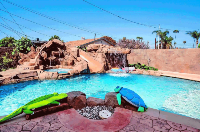 Just minutes from Knott’s Berry Farm, South Coast Plaza and Disneyland, this two-story home is a family getaway dream. With a heatable saltwater pool and hot tub, a rock slide, waterfall, spacious BBQ area, and even a putting green, you’ll have everything you could ever need to keep littles entertained this summer.