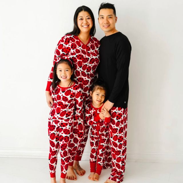 These seasonless bamboo jams from Little Sleepies feature sweet little ladybugs dotted with hearts, and cover the whole family + accessories.