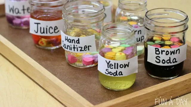 Tiny conversation hearts are big on charm but short on taste. Kids can use these little love messages to start a different type of conversation. First, fill recycled plastic bottles with various forms of liquid. Drop in candy hearts and observe what happens next! Check out Fun-A-Day for the lowdown.