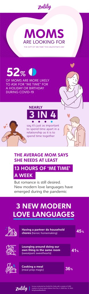 The study, conducted by OnePoll with Zulily was all about uncovering what mamas want after the horror that was 2020. It found that the number one “gift” was “me time” and that’s pretty much all it takes to feel loved this V-Day.