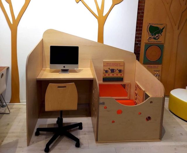 We don’t like to exaggerate, but we’re pretty sure that the Henrico County Public Library should receive the Nobel Peace Prize for it’s genius caregiver-child workstation, which includes a baby-proof safe space (aka crib) next to an adult workspace (computer access, included).