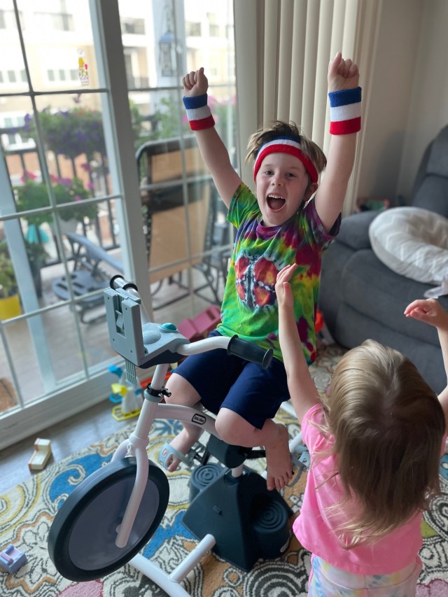 I am a huge spin class fan (but only at home where people can’t see what a mess I am!) and I love my at-home cycling setup. When the Pelican arrived, I have to admit, I was a little jealous… of my five year old—This. Is. COOL! It’s a mini-version of my favorite ride to nowhere plus a full sensory experience—nothing “stationary” about it. Here’s what blew us away about the Pelican: