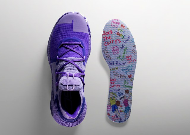 In addition to a “United We Win” sockliner, Riley designed a sockliner that features two girls playing basketball, surrounded by the words that inspired Riley to play the role of a Uniter, such as “Be Fearless,” “Girl Power,” “Be the Change,” Girls Hoop Too” and “Rock the Currys.” Shoppers also have the option to customize a sockliner with their own photo.