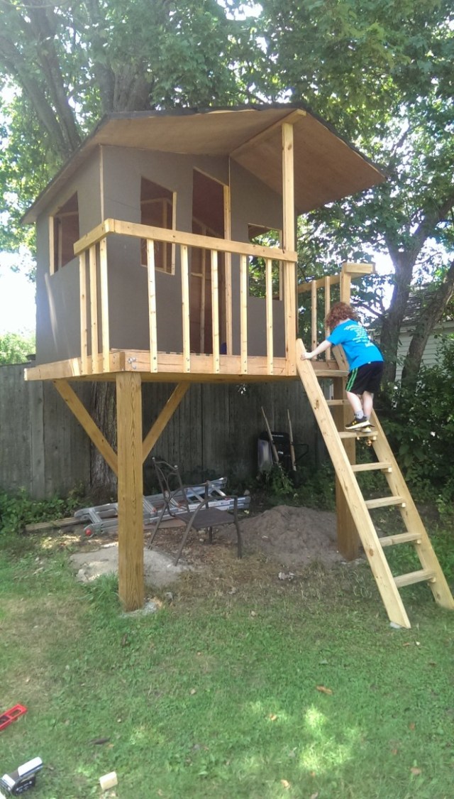 The treehouse came out awesome, but not perfect. The door kind of shuts and the windows semi-fit the walls. But the most obvious misstep turned out to be an actual misstep. Tim worked on constructing the ladder without plans and it came out brilliantly. Except for the top step. It sticks out at a weird angle and needs to be pointed out to all new-comers so they pay attention going up and down.
