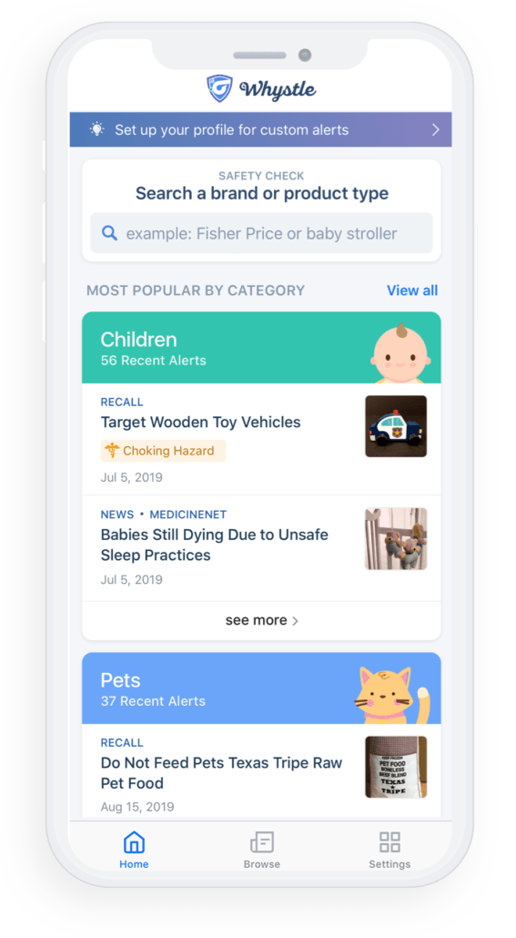 • When you’re researching a new product or brand, Whystle will provide a history of for that specific product type or a safety record of the brand. You’ll know whether the stroller you’re eyeing has presents a choking hazard or the dog treats you’re buying for Fido is contaminated.